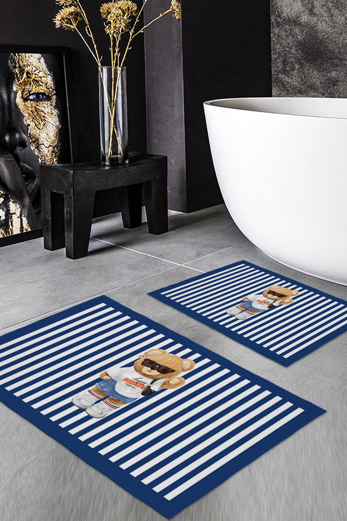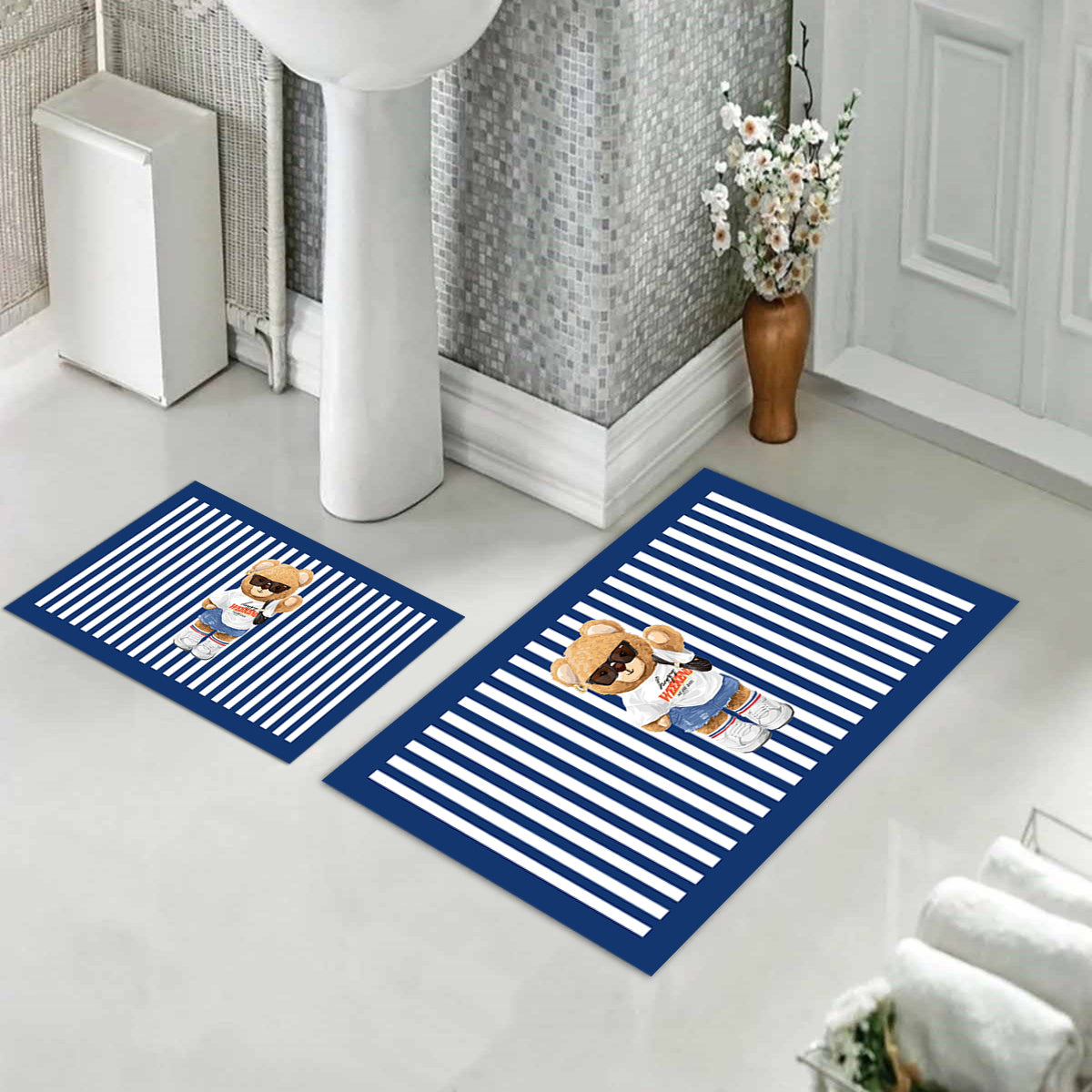 Milbay Modern Çizgili Ayıcık Desenli Banyo Paspas Seti