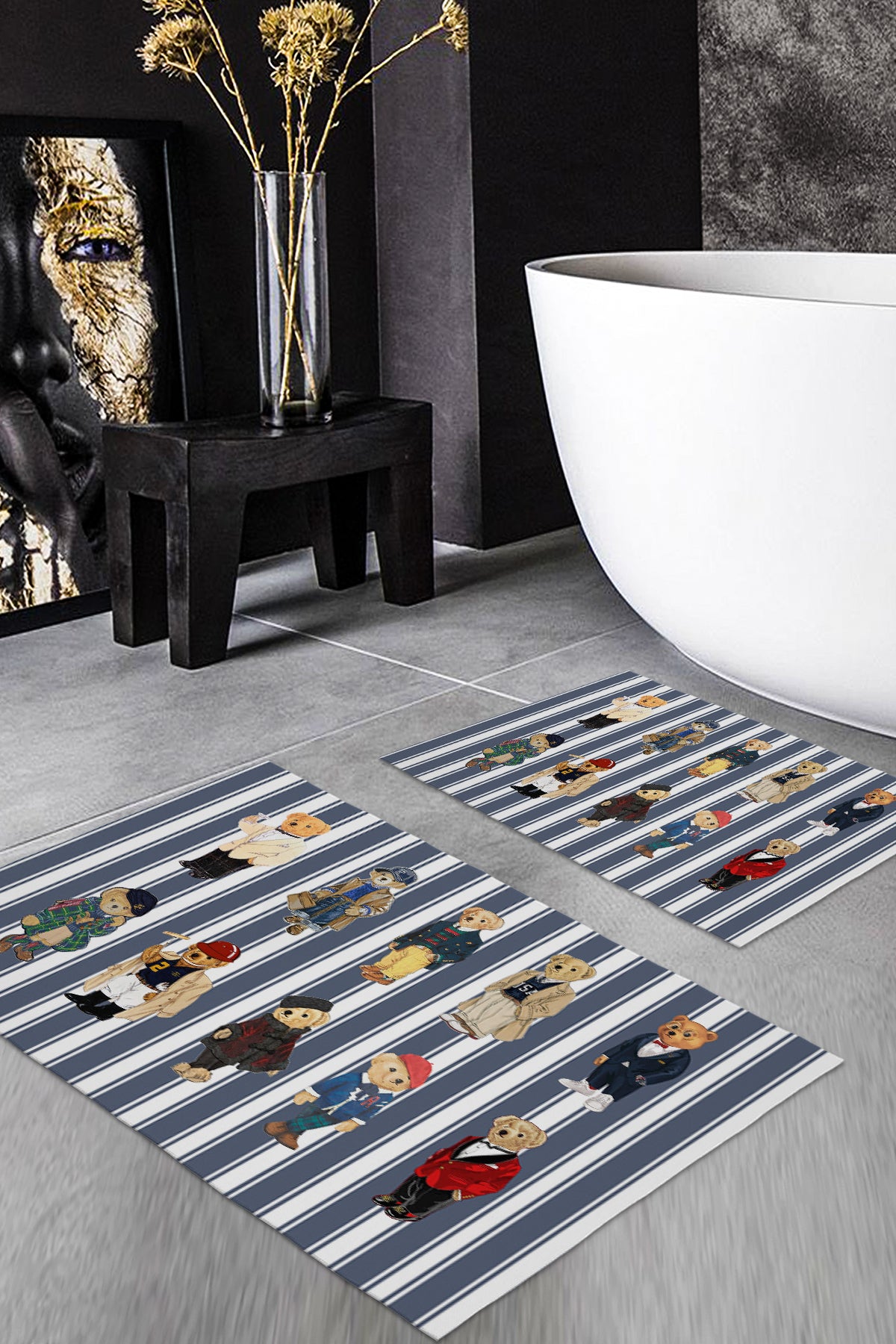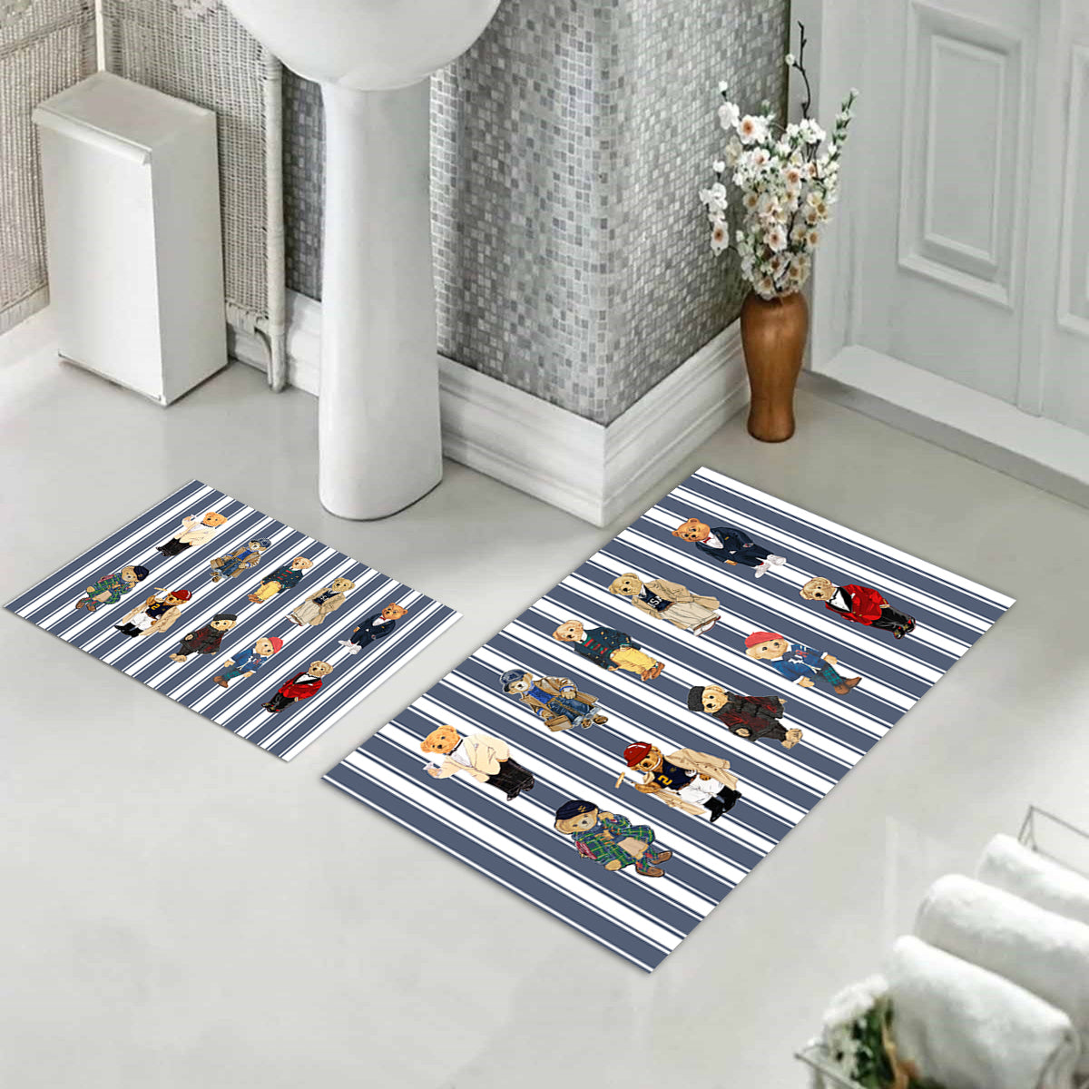 Milbay Çizgili Ayıcık Desenli Banyo Paspas Seti