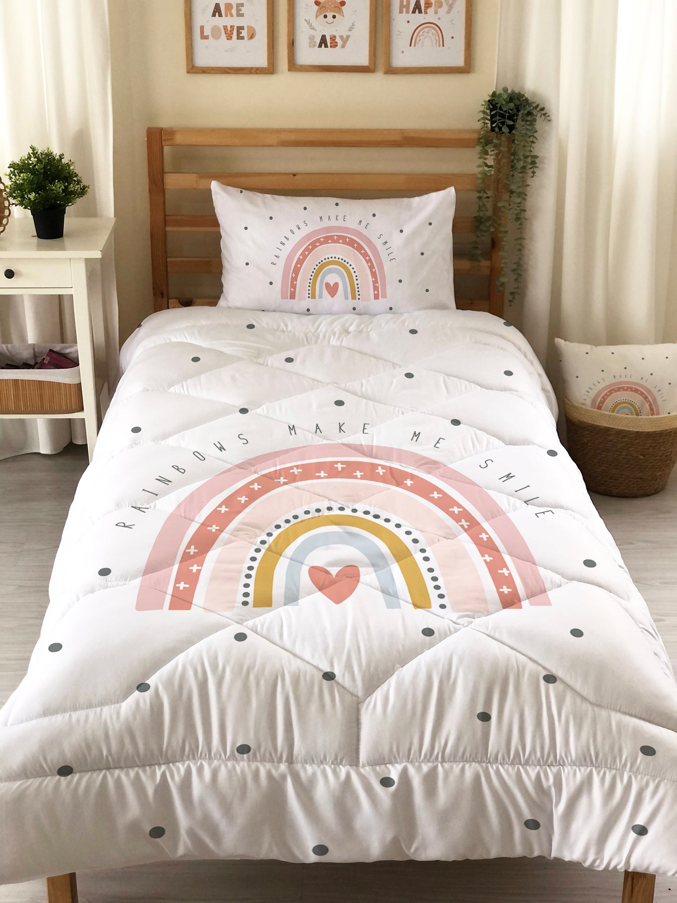💫🎈🌈 Çocuk odası dekorasyonuna renk katacak, Milbay Gökkuşağı Renkli Desenli Kapitone Yorgan ile çocuklarınızın odası daha sıcak ve enerjik bir hava yakalayacak. 🌟 Çocukların hayal dünyasını genişletecek renkli ve desenli kapitone yorganımız, dijital baskı kalitesiyle uzun süre boyunca ilk günkü canlılığını koruyor. 🌟