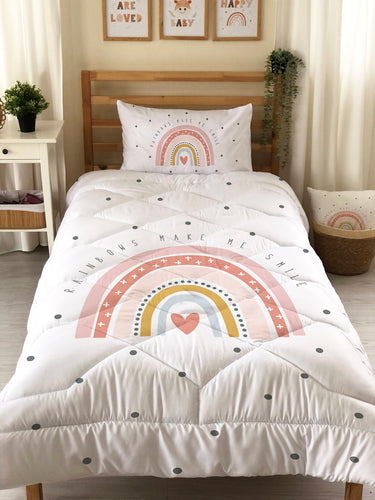 Çocuk odası dekorasyonunu tamamlayacak farklı ve canlı tasarımıyla Milbay Gökkuşağı Yorgan, ev dekorasyonuna da enerji katan çocuk tekstil ürünleri arasında yer alıyor. 🌟💫🎈