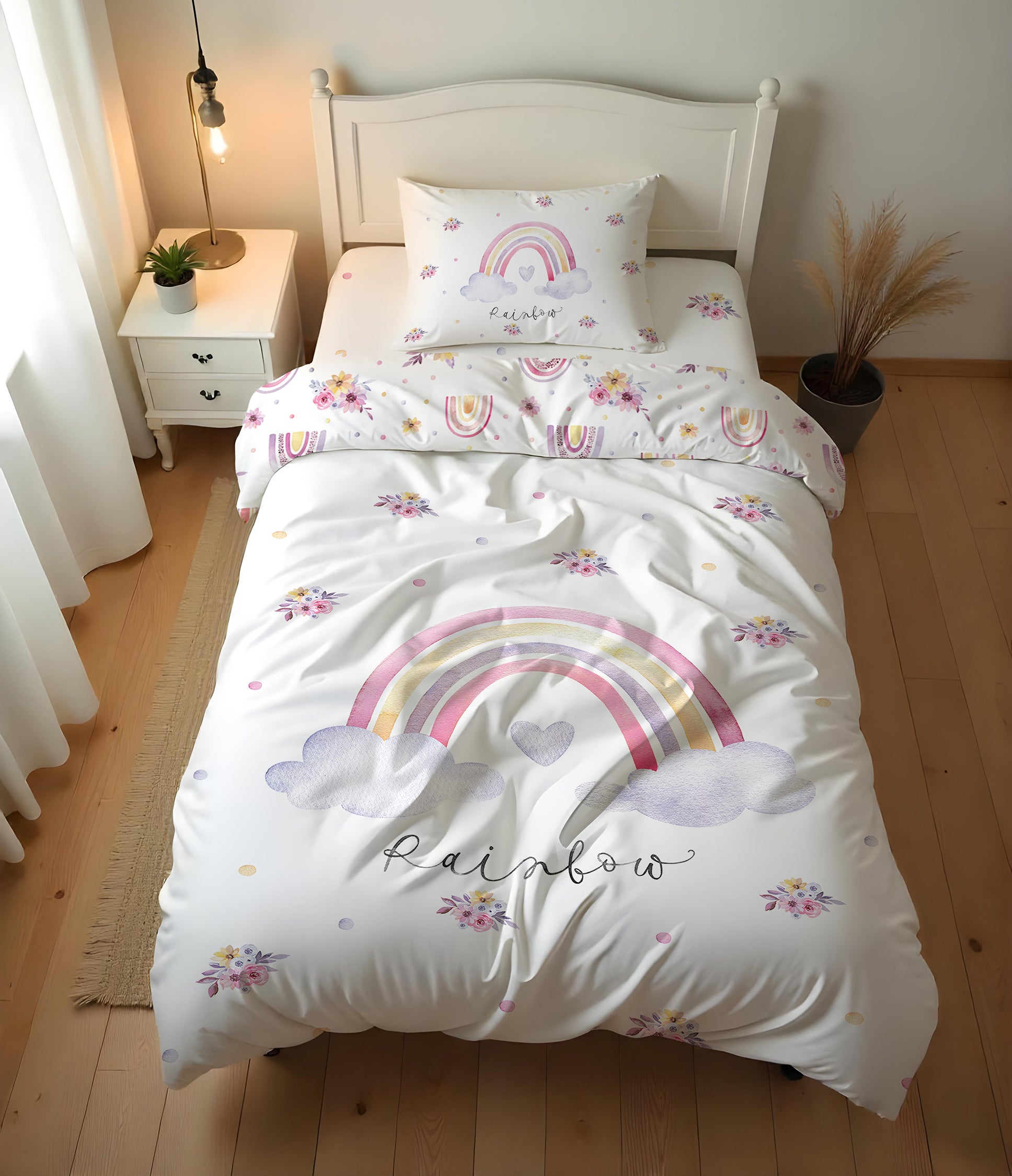 🌺🌟 Çocuğunuza özel tasarlanmış Milbay Gökkuşağı Çiçek Desenli Nevresim Seti! Bu set; çocuk odası dekorasyonunu canlı ve neşeli renkleriyle tamamlayacak bir ürün. Şık çiçek desenleri ve dijital baskı teknolojisiyle parlak, canlı renklere sahip olan nevresim setimiz, çocuğunuzun odasına eğlenceli bir hava katacak!🌈👧🏻👦🏻 Yüksek kaliteli kumaşı sayesinde göz alıcı görünümünü uzun süre korur. 🌼🎀