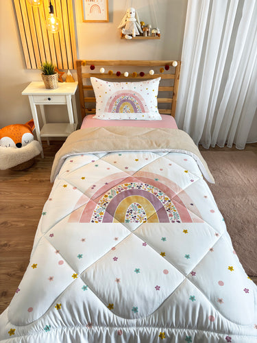 Üst üste yerleştirilmiş renkli çizgileri ve çiçek desenleri ile tam bir gökkuşağı estetiği sunan Peluş Yorgan, çocuklarınıza sıcak ve rahat bir uyku ortamı sağlar. 🌈 💤 Diğer çocuk tekstil ürünleri ile kombin yaparak odanıza hareket katabilirsiniz.