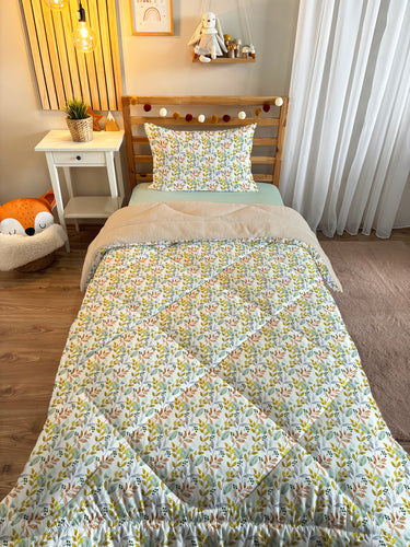 💫 Renklerini ve desenlerini uzun süre koruyabilmesi için dijital baskı teknolojisi kullanılmıştır. Doğa esintisi desenleri ile çocuklarınızın odasına fresh bir atmosfer katacak. Kapitone dikişli yapısıyla hem şık bir görünüme sahip hem de sıcak tutma özelliğine sahiptir.