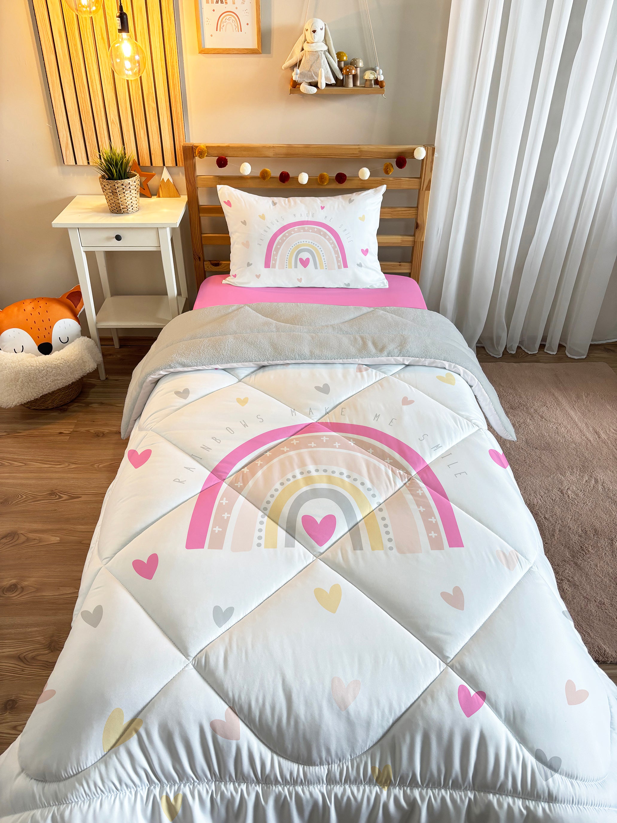 🎨 Evinin en tatlı odası çocuk odasını, Milbay Gökkuşağı Kalp Desenli Peluş Yorgan ile renklendirmeye ne dersiniz? 🌈 Bu çocuk peluş yorgan, çocuk odası dekorasyonunu şık ve eğlenceli bir hale getirerek, fark yaratır. 😍