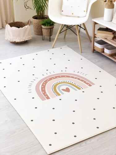 Dokuma taban çocuk halısı özelliği ve kişiye özel tasarım imkanı ile Milbay Gökkuşağı Kalp Desenli Çocuk Halısı, çocuk odası dekorasyonunda vazgeçilmez bir parça haline gelecek. 🏡✨
