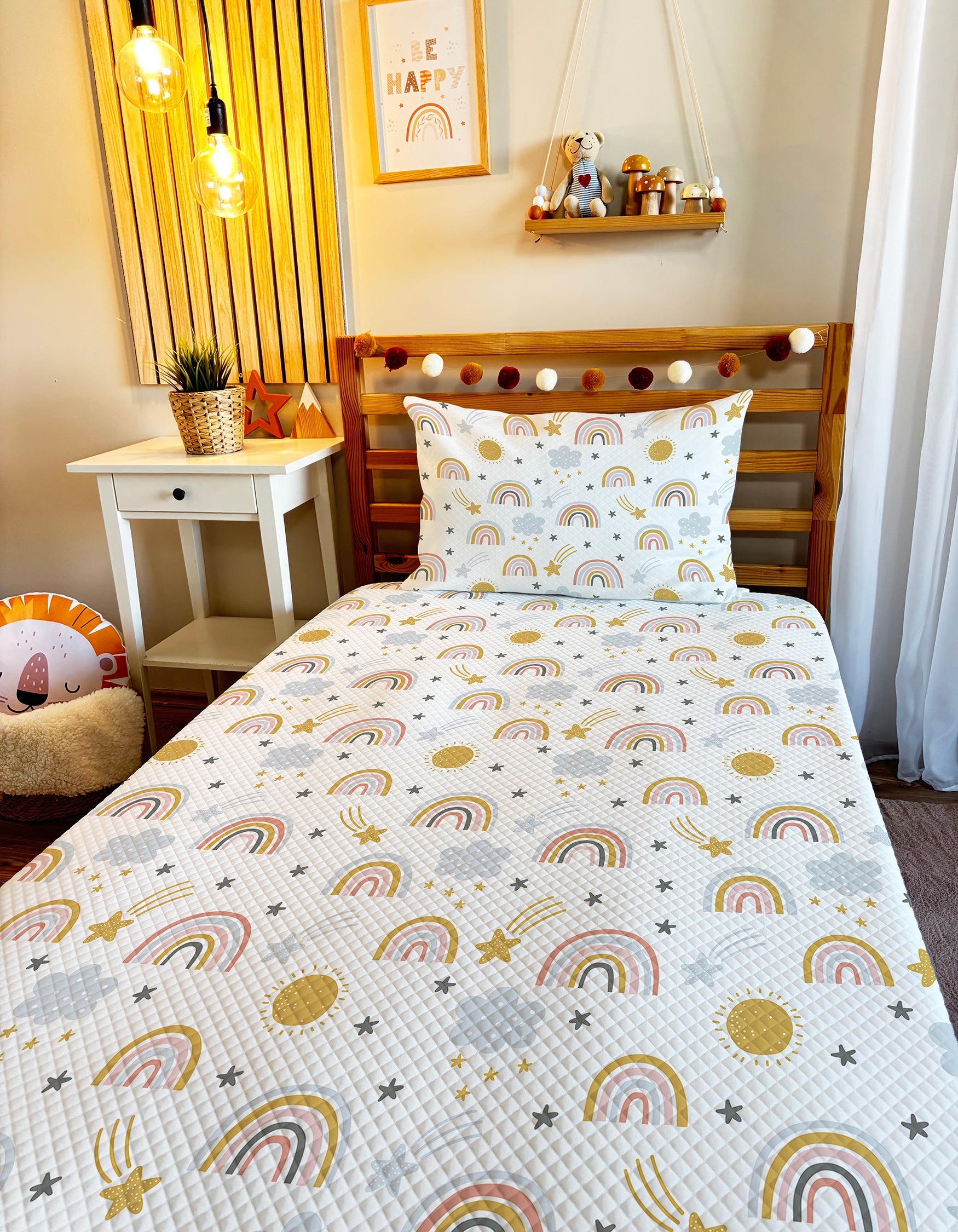 Dijital baskı teknolojisi ile hayat bulan bu pikenin canlı renkleri, çocuk odalarına neşe ve enerji katarak uzun süre solmadan kalıcı olacak.🖌️🎨 Bu gökkuşağı desenli pike, çocukların uykularını daha eğlenceli ve konforlu hale getirecek. 🛌