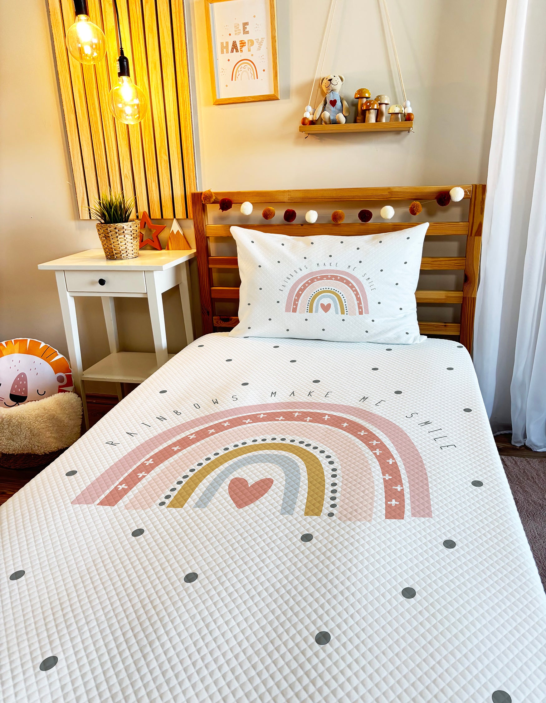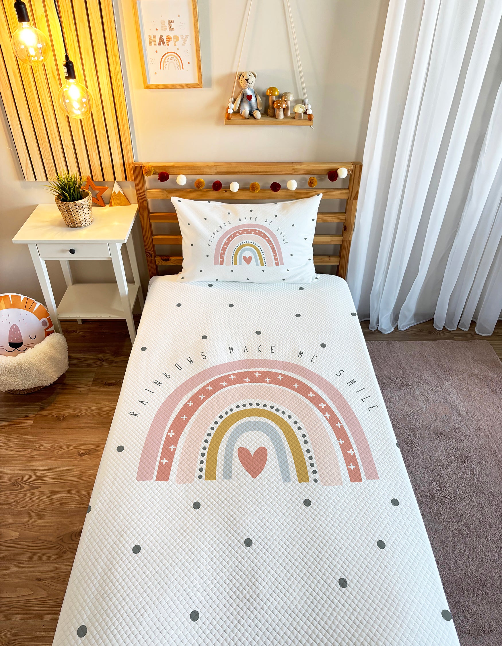 Dijital Baskı Pike teknolojimiz ile üretilen Gökkuşağı Desenli Pike, renklerin canlı ve solmaz olmasını sağlar. 🌟 Bu sayede pikelerimiz uzun süreli kullanımlarda bile ilk günkü gibi kalır. 🔄 Çocukların hassas ciltleri için özel dokuma polyester kullanılmıştır. 🐾