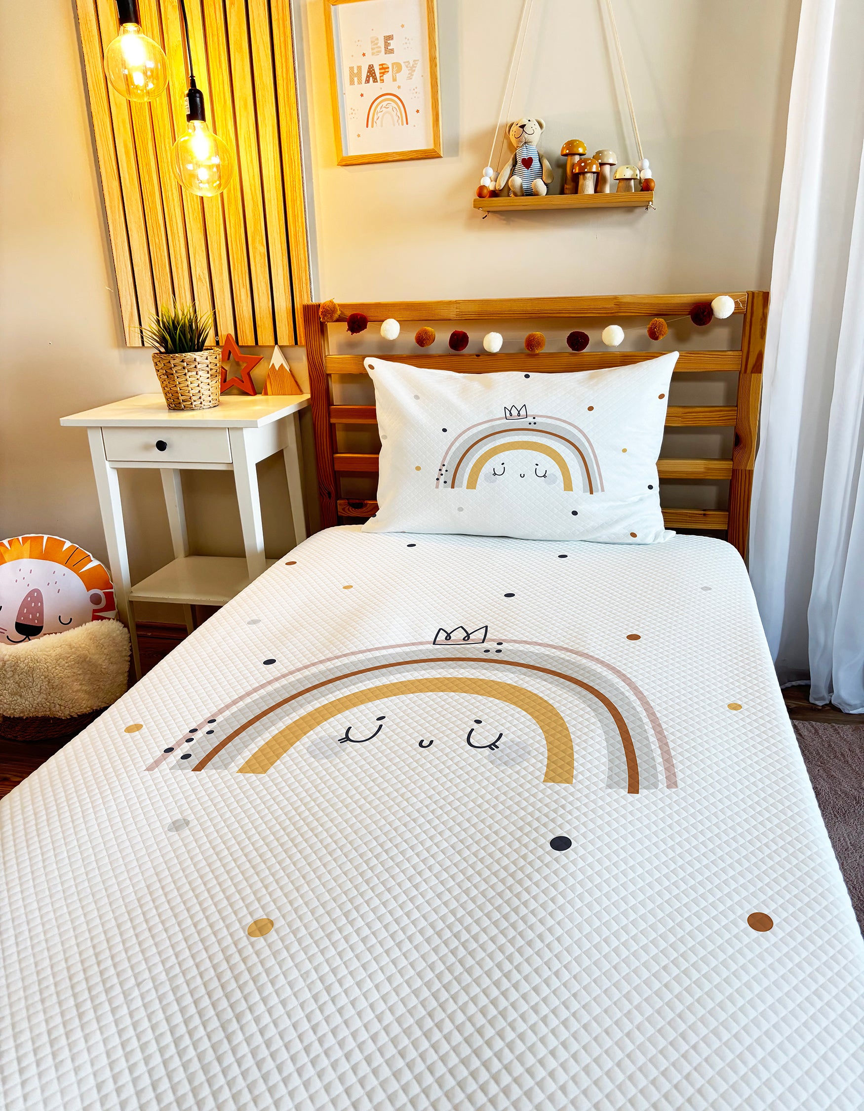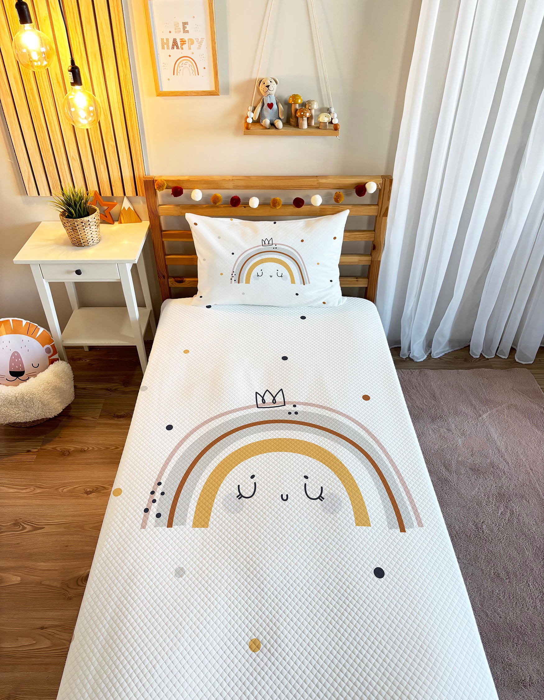 🌈Milbay Gökkuşağı Rüya Desenli Pike Modeli, çocuk odalarına renk ve hayal gücü katan özelliklere sahiptir. 🚀Çocuklar için tasarlanmış bu harika pike, evinizin dekorasyonuna da eşsiz bir katkı sağlayarak çocuk odanızı daha canlı ve eğlenceli hale getiriyor. 🦄Gökkuşağı ve rüya temalı bu deseni dijital baskı teknolojisi ile polyester kumaşa işledik. Bu sayede, renklerin canlılığı uzun süre korunur ve solmaz. 🎠