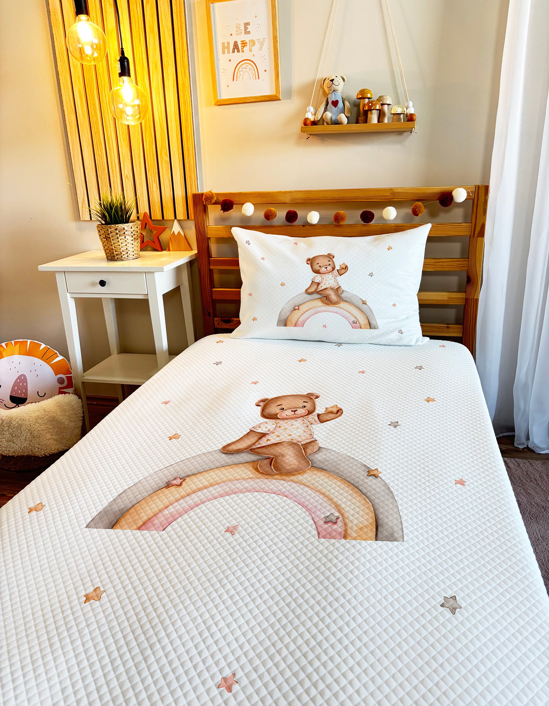 🌈🐻Milbay Ayıcıklı Gökkuşağı Desenli Pike Modeli, çocuk odalarına renk ve canlılık katacak sevimli bir seçenek! 🛏💫 Ayıcık desenli bu özel çocuk pike modeli, hem rahatlık hem de stil arayanlar için mükemmel bir tercih. Çocuk odası dekorasyonuna eşsiz bir dokunuş katarak oda atmosferini sevimli ve rahat bir hale getiriyor. 🎈🎠