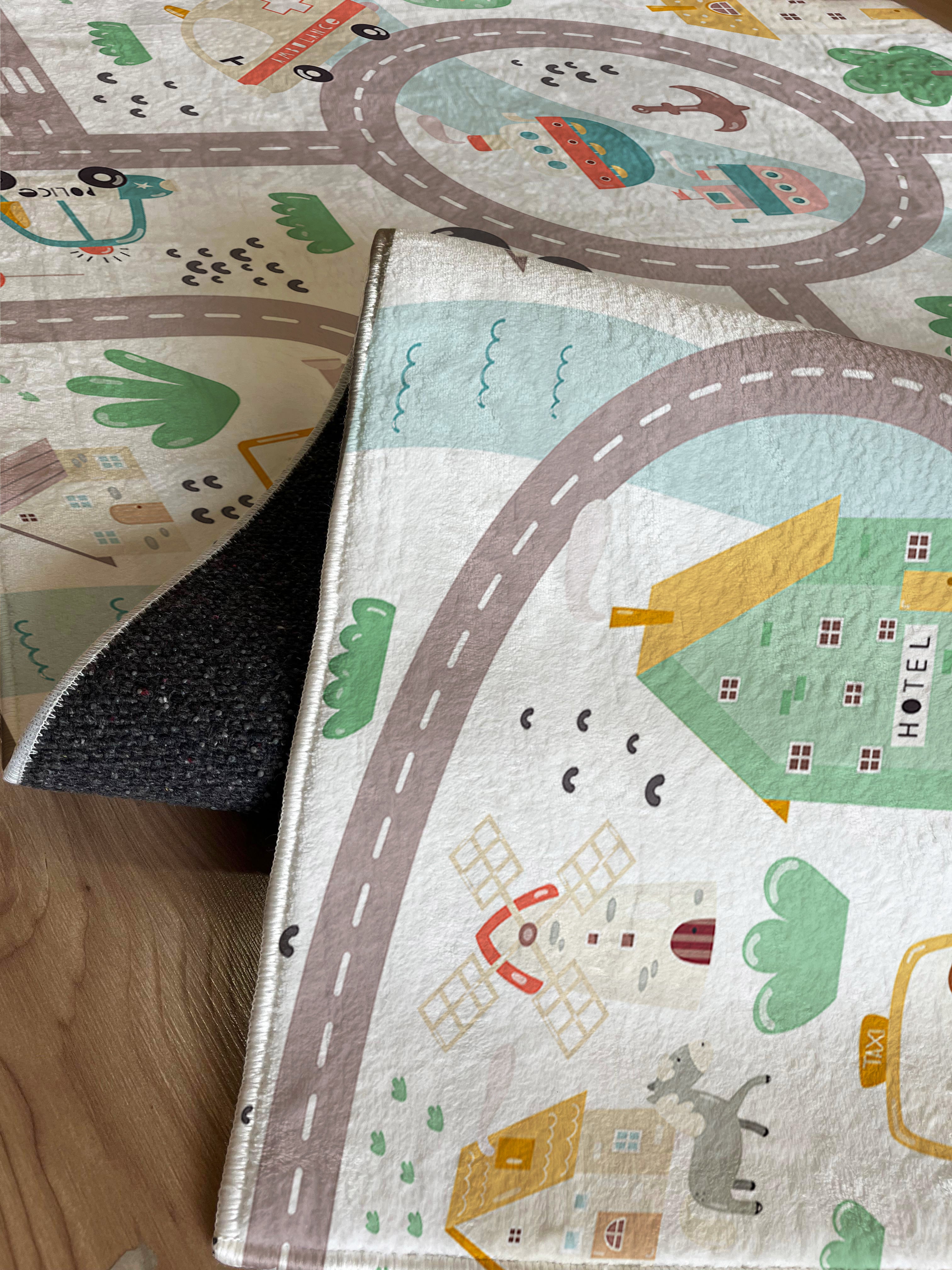 💫 Milbay Oyun Parkuru Desenli Çocuk Halısı, dijital baskı teknolojisi ile üretilmiştir. 🖨️ 🎨 Bu sayede desenler daha canlı ve etkileyici görünür.